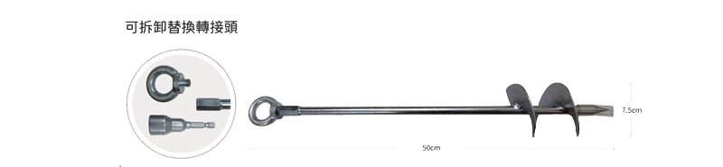- 可拆卸替換轉接頭-可根據不同功能替換轉接頭。環形接頭用於連接樹木綁帶的功能;六角接頭則可以透過電動工具的旋轉力,快速將樹木固定器旋入土壤中,減少人力耗損