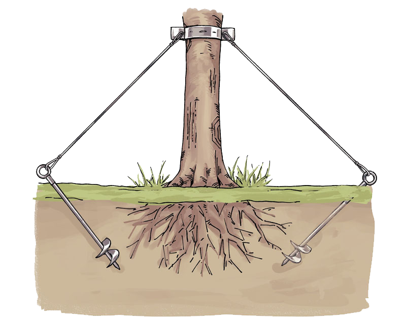① 固定釘打入土壤後,透過鋼索與束帶連接樹木,形成穩固的支撐系統強風來襲時,有效防止樹木傾倒,確保其穩定生長。